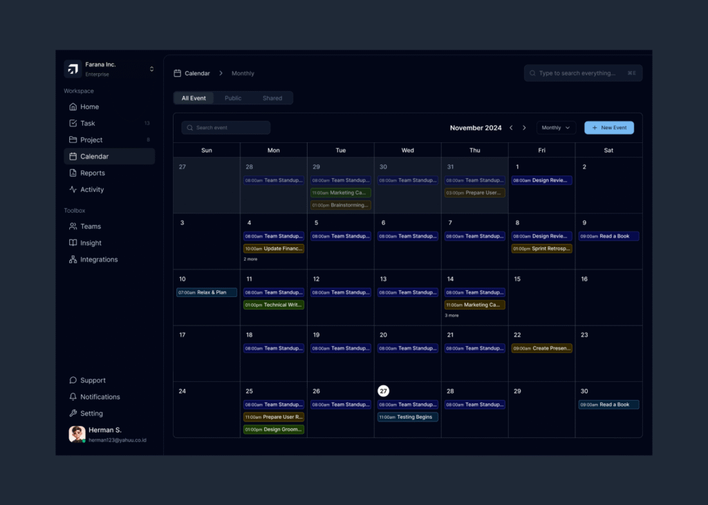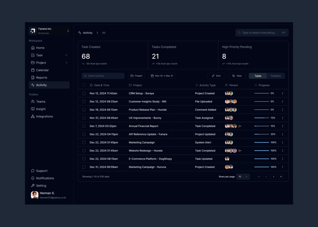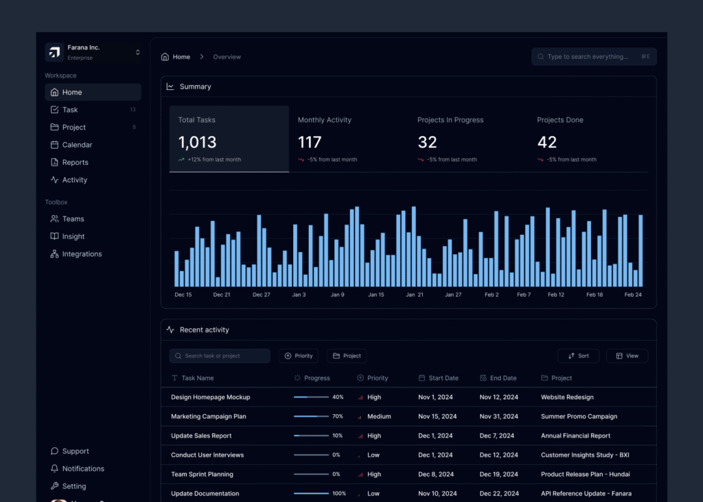 The task management platform I designed aims to simplify complex workflows and enhance productivity for users at all levels. From the dashboard that provides quick, essential insights at a glance, to the clean and intuitive calendar that helps users stay organized, every element has been crafted with clarity and usability in mind. The activity tracking system ensures transparency and empowers users to monitor progress and make real-time improvements, while the task page offers flexible views like Kanban boards to suit diverse needs and foster better workflow visualization.